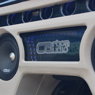 Obviamente el sistema gira en torno a los componentes de Carbon Audio, pero también se incluyeron SUONO con un procesador de sonido Merlín para ajustar todo el equipo, cables RCA y cable en calibre 12, 4 y 0, así como terminales CTM 100% de cobre, la unidad principal Kenwood modelo eXcelon DDX795 instalada al centro del tablero, 4 baterías NorthStar, 2 fuentes reguladas Genius de 100 Amperes cada una y un osilador para separar el equipo de la batería del auto.