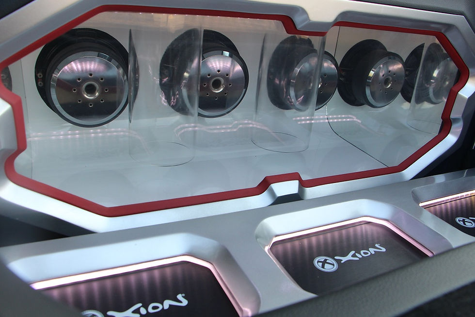 Tras los respaldos de los asientos posteriores queda al descubierto una tercia de subwoofers de 10 pulgadas de la Serie X4 de Xion, son doble bobina de 2 Ohms; el bafle presenta un tapizado en alfombra, injertos en color rojo e iluminación en la circunferencia de los subwoofers.