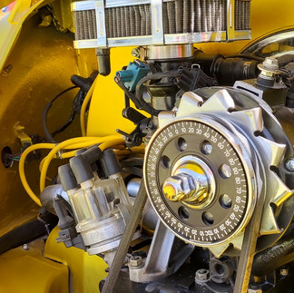 El habitáculo luce muchos detalles pintados al color de la carrocería, como el tablero, kick paneles y las tapas de las puertas. Volante de un Volkswagen más moderno, perilla de la palanca de velocidades Scat, asientos de Porsche y un juego de cubiertas de pedales de aluminio con antiderrapante.