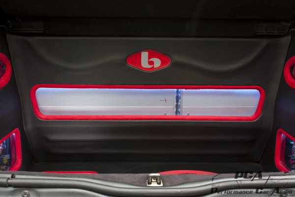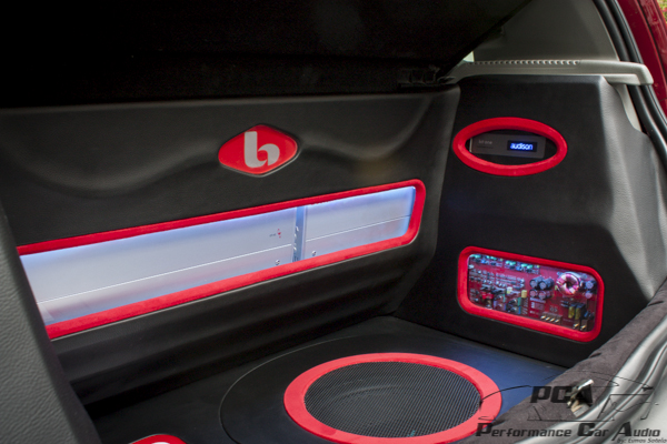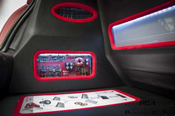 37. Forramos la tapa del subwoofer en vinil negro y el marco en Suede rojo, y fabricamos una rejilla a medida para su protección.