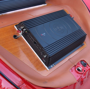 Por último, bajo el cofre se fabricó un panel a la medida con acabados en madera y vinipiel color chedron, donde se instaló el compresor y el tanque de la suspensión neumática. También podemos encontrar, de arriba hacia abajo, primero un amplificador db Drive modelo A7 125.4 encargado de alimentar los medios y tweeters. En segundo lugar un amplificador db Drive modelo A7 1500.1, destinado para el par de subwoofers de 10 pulgadas.